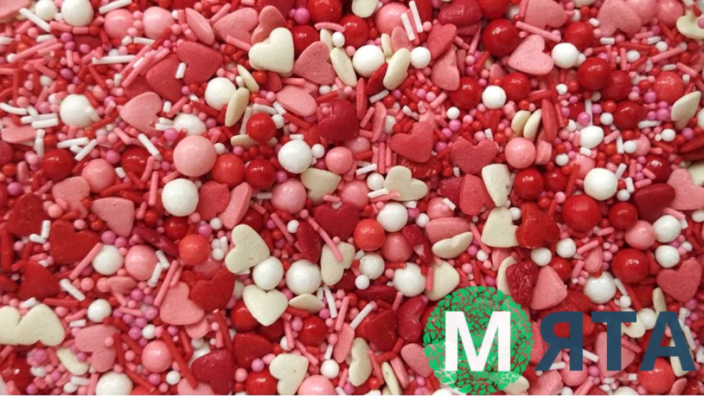 Цукрове посипання Мікс з глянсовими кульками №1. Червоно-біло-рожеві серця