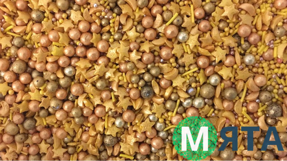 Цукрове посипання прикрасить будь-який десерт і зробить ще більш апетитним та привабливим. Складається із зірочок, паличок, півмісяців та кульок різних діаметрів та відтінків золота.