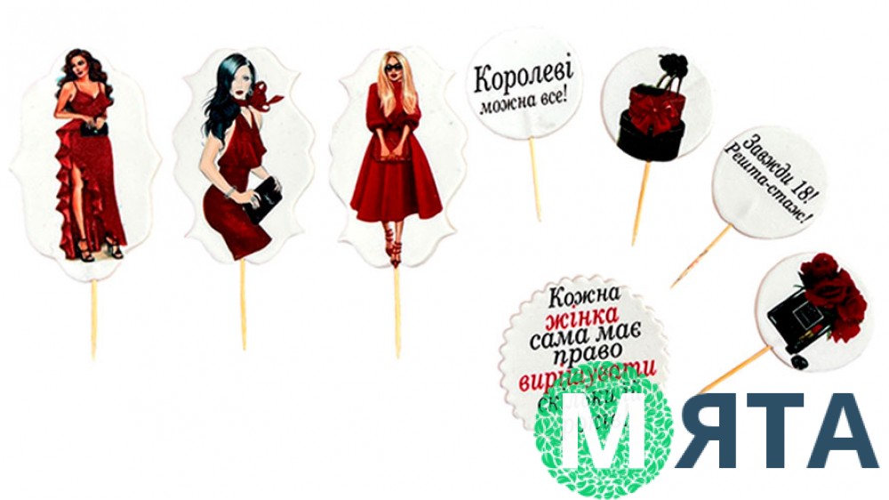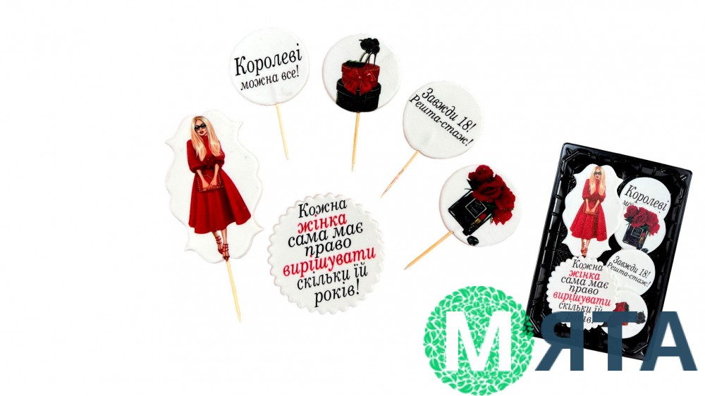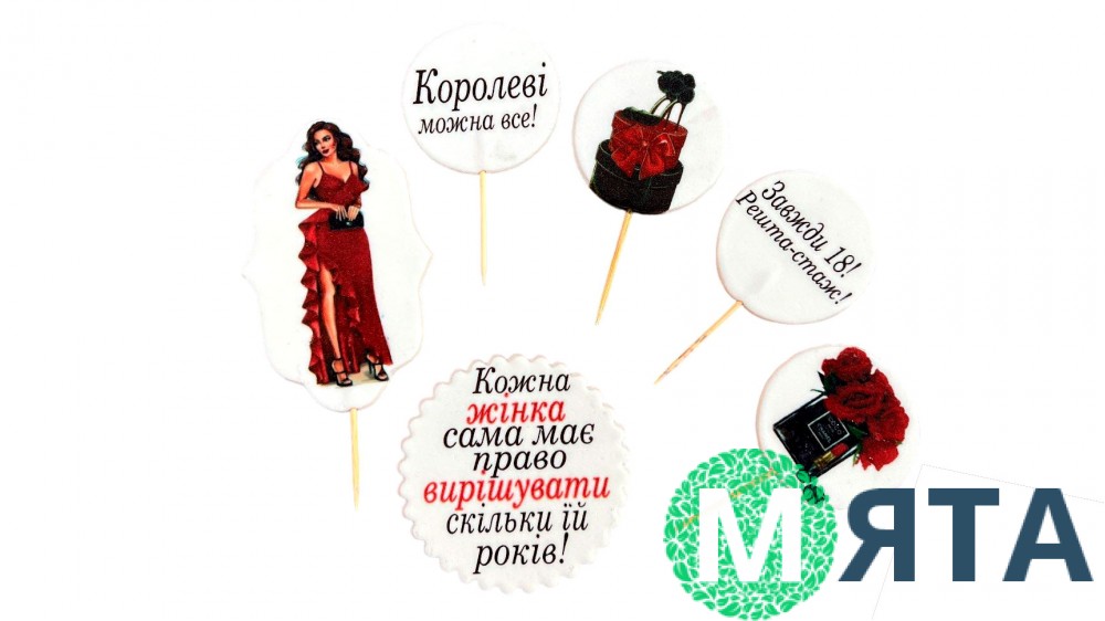 Склад набору: дівчина 11*7 см, круглі топери 6 см - 4 шт, топер із рюшкою 7 см.